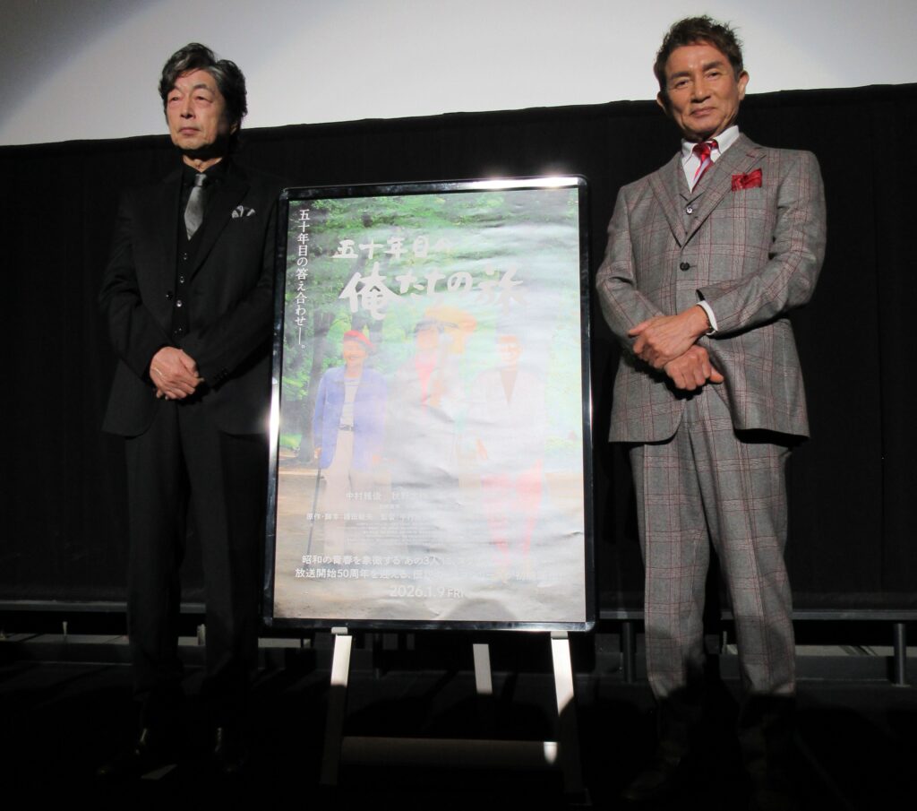「俺たちの旅」について、中村さんは「当時、青春モノ、と云われるドラマはいっぱいやってました。その中の1つだったんですけど、その時は健ちゃんと俺とでワイワイワイワイ楽しいんだけど、撮影現場に行くだけで楽しいドラマだったんですけど、それが50年の年月の中で、青春モノの金字塔みたいない言い方をされるようになって、すごく嬉しい誤解がありました。でも今日に至って、映画化されるという運びになったのは、ホントに皆さんが「俺たちの旅」を愛してくれたからこそ、やっぱり成立したことだと思っているので、改めて本当にありがとうございました」と感謝の気持ちを伝えていく。田中さんも喜んでおり「50年経ちましたね、ホントに。でも、こんなことができるのは、ホント奇跡ですね」と感慨深げだ。